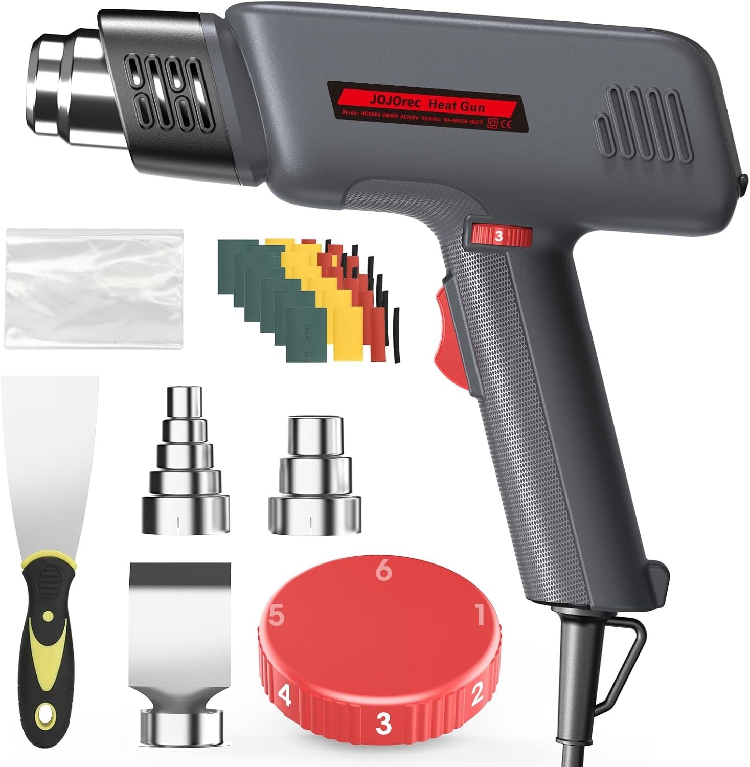 Leistung & Temperaturbereich: Stufenlose Temperaturregelung bis 600°C.Luftstrom & Aufsätze: Sechs verschiedene Zubehörteile inklusive.