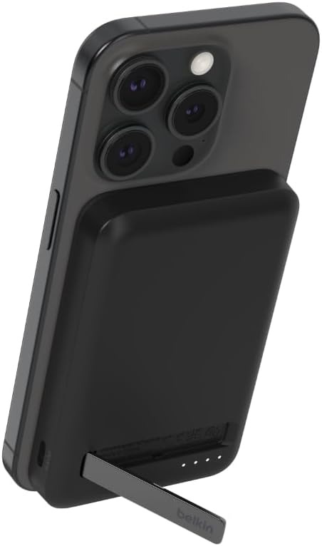 Design & Mobilität: Kompakt (10.7 x 6.6 x 1.8 cm) und mit 218g leicht. Ein ausklappbarer Ständer auf der Rückseite ermöglicht es, das iPhone im Quer- oder Hochformat aufzustellen, während es lädt – ideal für Videos.