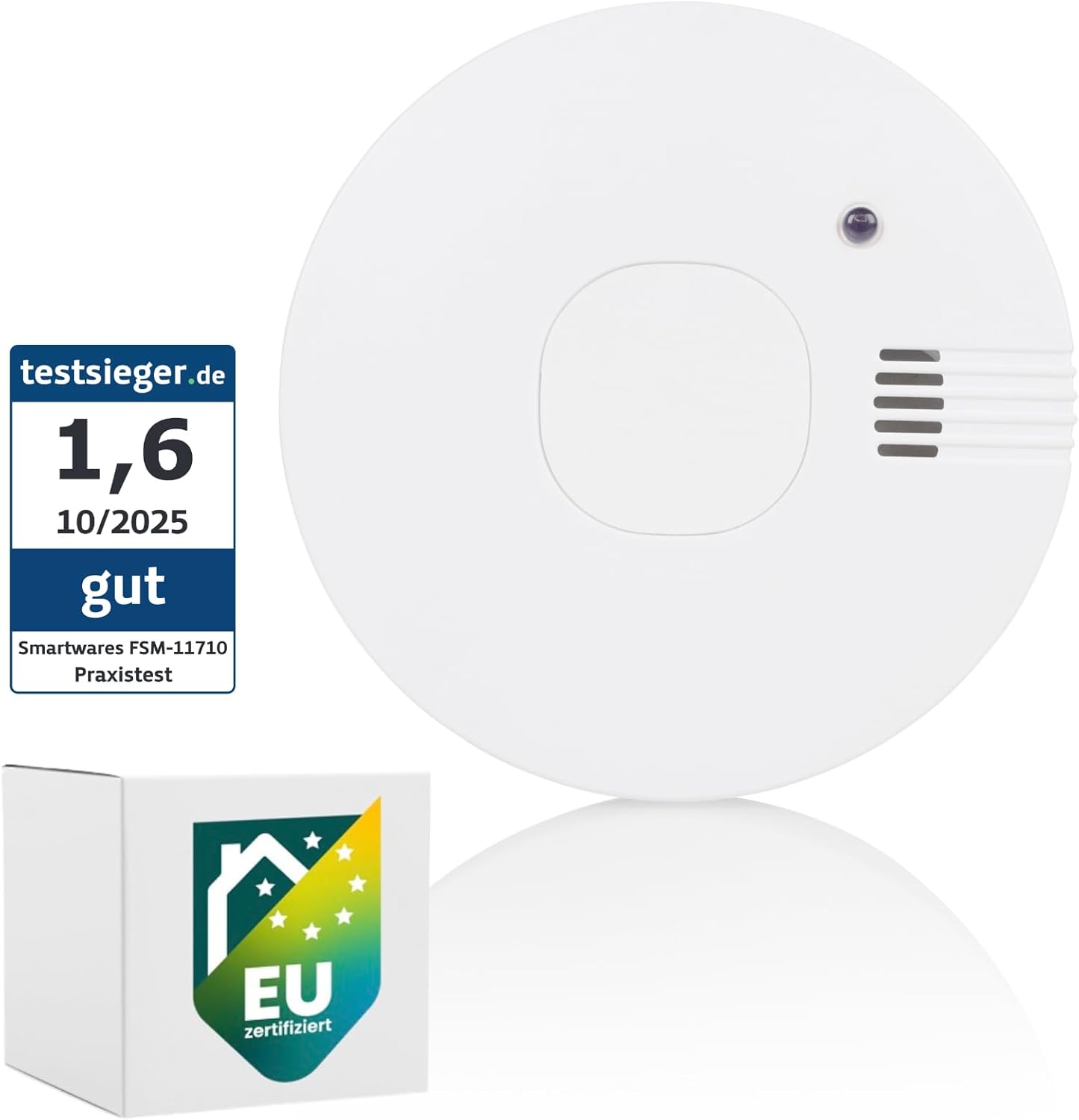 Sensortechnologie & Zertifizierung: Nutzt fotoelektrischen Sensor, nach EN 14604 zertifiziert.